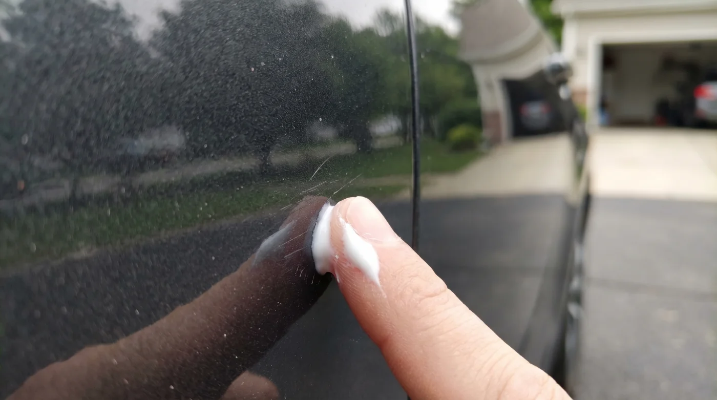 This happens when another car’s bumper or a painted post leaves its physical DNA on your door. The scratch isn’t a valley; it is a ridge. You will feel it sitting proud of the surface. Toothpaste is exceptionally aggressive against foreign paint, breaking the bond and lifting the ugly door marks away without traumatising your own clear coat underneath.